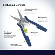 - Deluxe Comfy-Grip ergonomic handles relieve hand stress while cutting. EZ Clasp safety clip securely locks blades in the closed position when not in use for safe storage. Corrosion resistant construction lasts season-after-season.